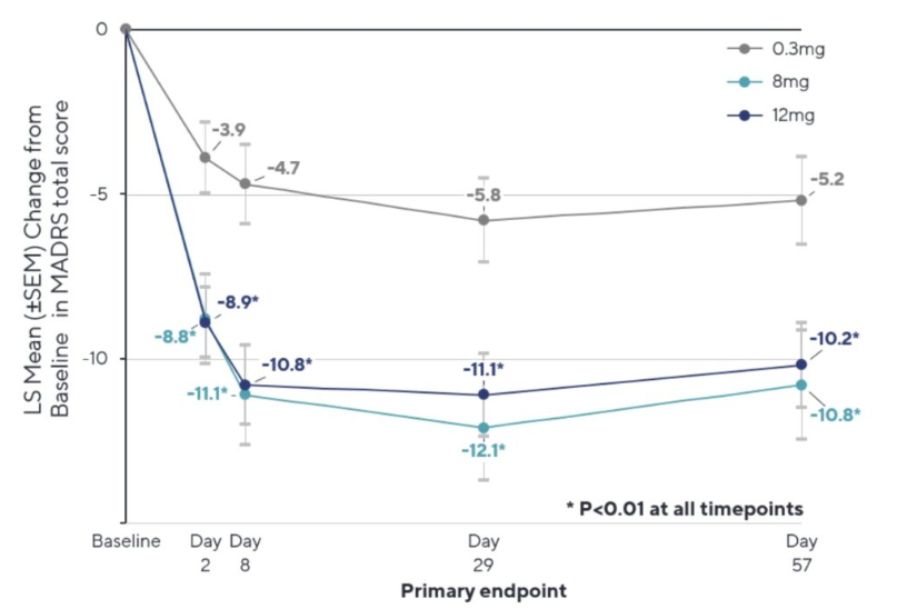 El hallazgo principal fue una impresionante reducción de -15,5 en la MADRS ajustada al placebo al día 8, con un 57,5 ​​% de los pacientes expuestos al fármaco en remisión al día 8, frente al 0 % en el grupo placebo. La compañía también informó una clara distribución de los criterios de valoración secundarios (CGI-S, HAM-A, Q-LES-Q-SF).