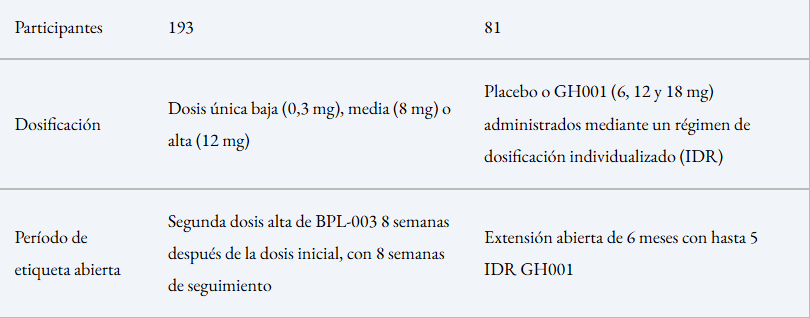 El protocolo de Beckley, por su parte, consiste en administrar a los pacientes una sola dosis, baja, media o alta. Si bien en el período de extensión abierto se comparará esta dosificación monofásica con un modelo bifásico (donde los participantes reciben dos aerosoles nasales de 4 mg y 8 mg, con un intervalo de aproximadamente 10 minutos), la parte ciega del informe de hoy no empleó esta estrategia.