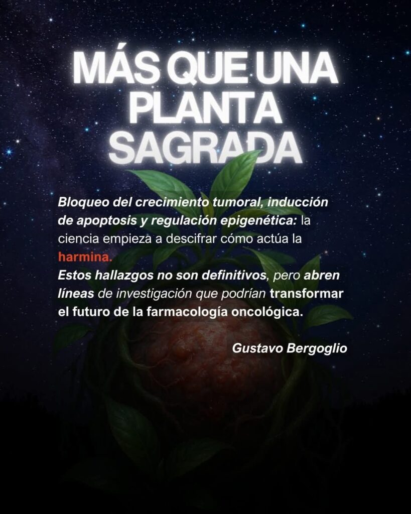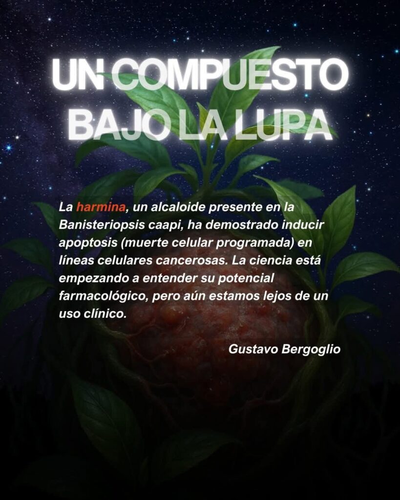 «La ciencia empieza a estudiar en serio los alcaloides del yagé, también conocida como ayahuasca . Entre ellos, la harmina muestra efectos prometedores en laboratorio: apoptosis, bloqueo tumoral, regulación epigenética.
